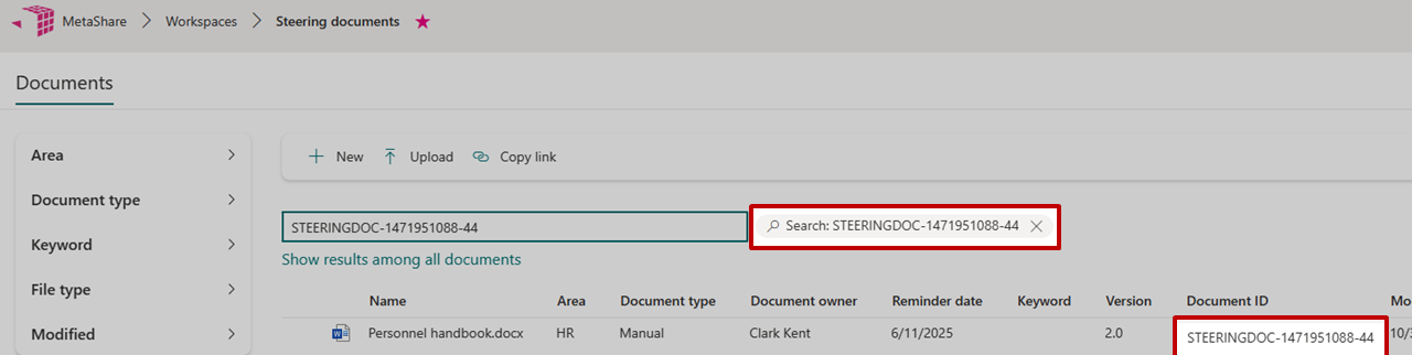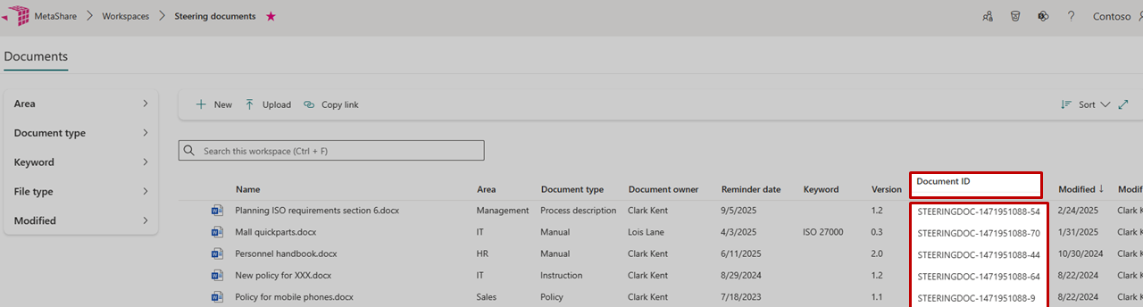 To be able to configure MetaShare to show Document ID as a column in workspaces, you first need to also activate the “Document ID Services” feature in SharePoint’s content type hub). Once this is done and you have configured your workspace configuration to show the column in the document view, you will be able to view the Document ID as a document column in workspaces:
